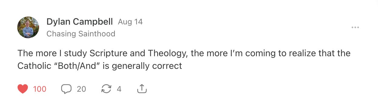 Most of these are from fellow Catholics, and mostly from that network I’ve had the good fortune of stumbling into. But in 2026, I’m hoping to go out and find people discussing the both/and in various ways and draw them into the conversation. (Truth be told, if you search “both/and” on Substack, there’s a veritable deluge of pieces on the theme—further confirmation, I think, of our culture’s hunger to go beyond dichotomous either/or thinking.) I’m also hoping I can make it a more regular feature of On the Way.